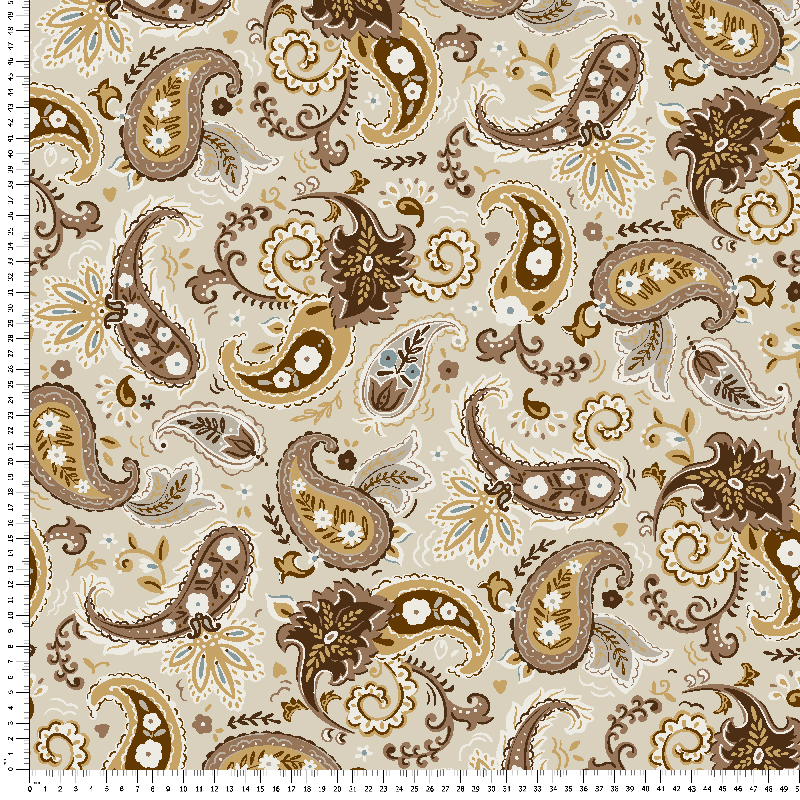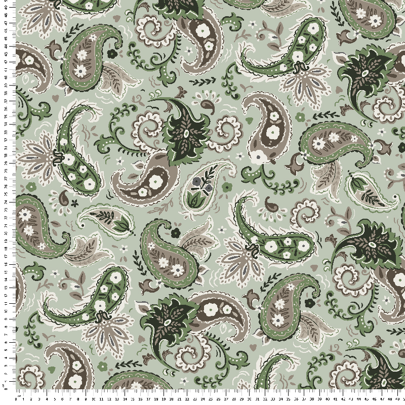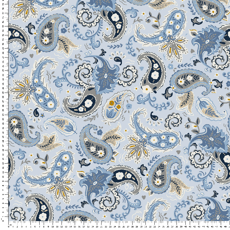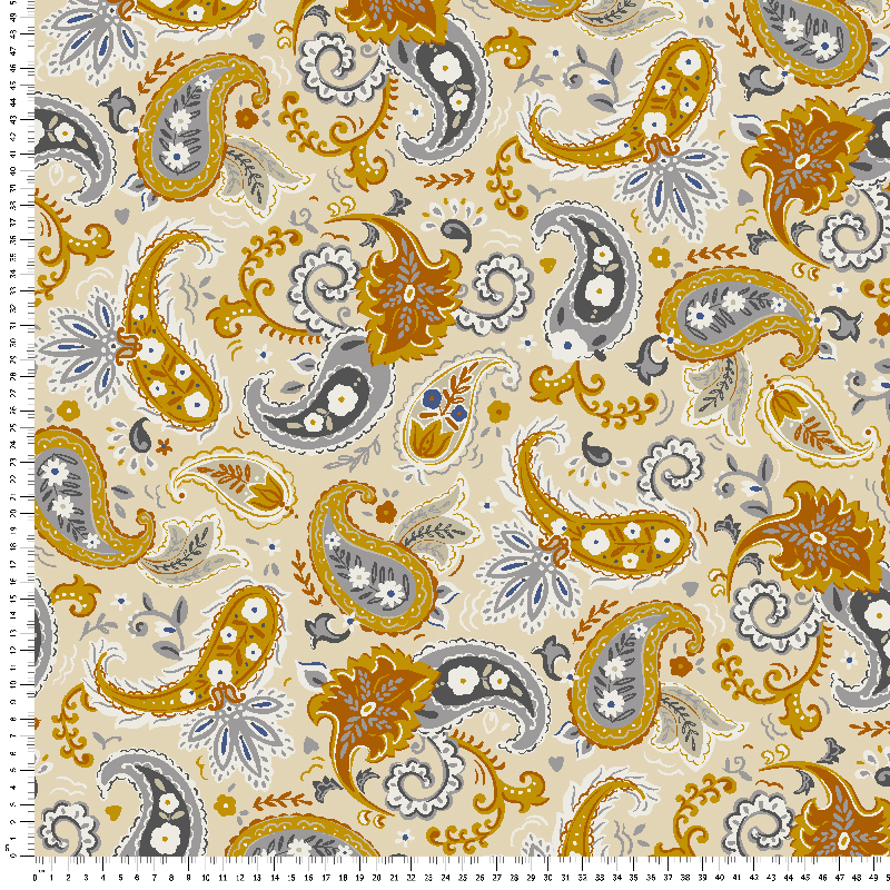 Dale un aire sofisticado y atemporal a tus proyectos con la colección EUSTACE, nuestra línea exclusiva de telas loneta estampadas en diseño cachemir (o paisley) muy característico, con motivos en forma de gotas curvas y detalles ornamentales florales y arabescos. El patrón se repite de manera elegante y está lleno de detalles finos que aportan sofisticación.